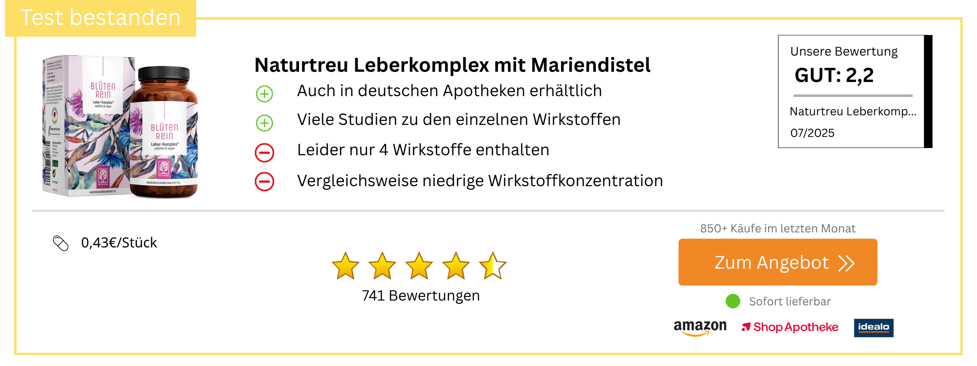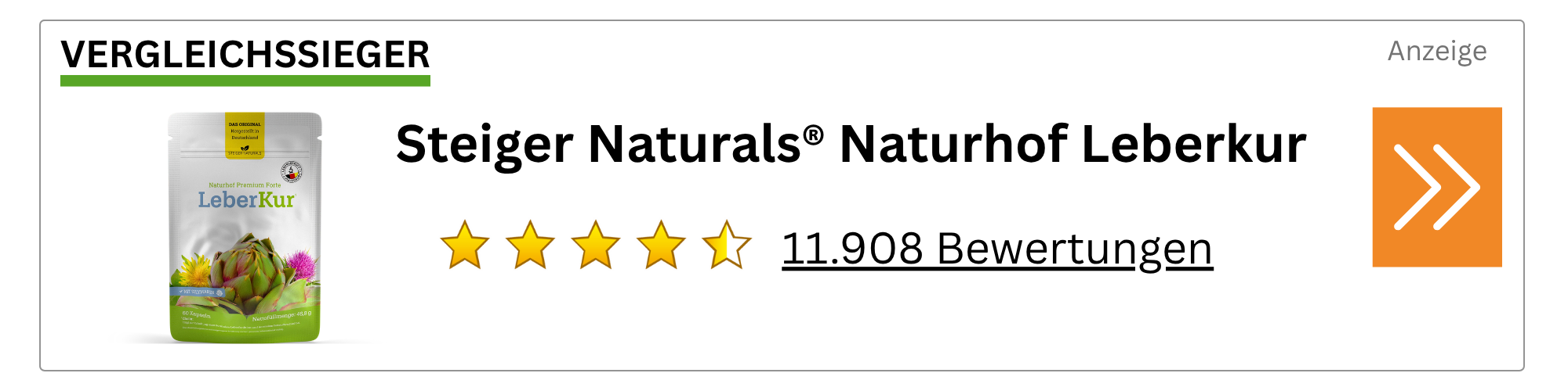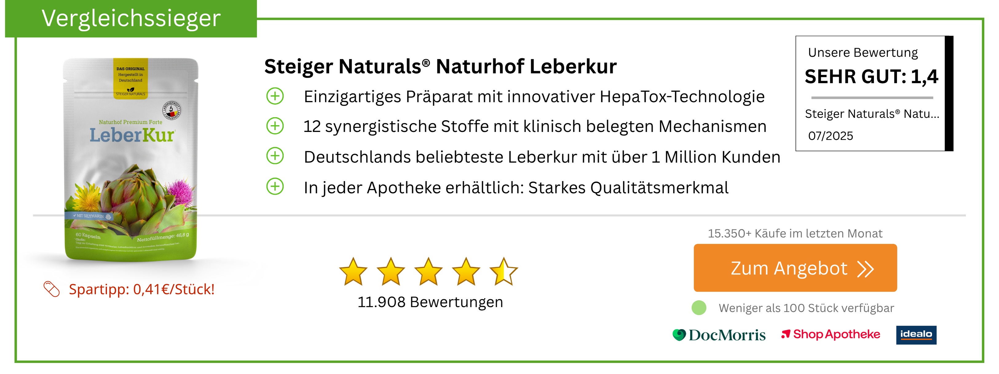 Nach dem Vergleich von über 50 Leberkur-Produkten steht fest: Die Naturhof Leberkur ist der eindeutige Testsieger. Als einziges Präparat kombiniert sie die innovative HepaTox-Clearing-Technologie mit 12 synergistischen Wirkstoffen in klinisch belegten Dosierungen.