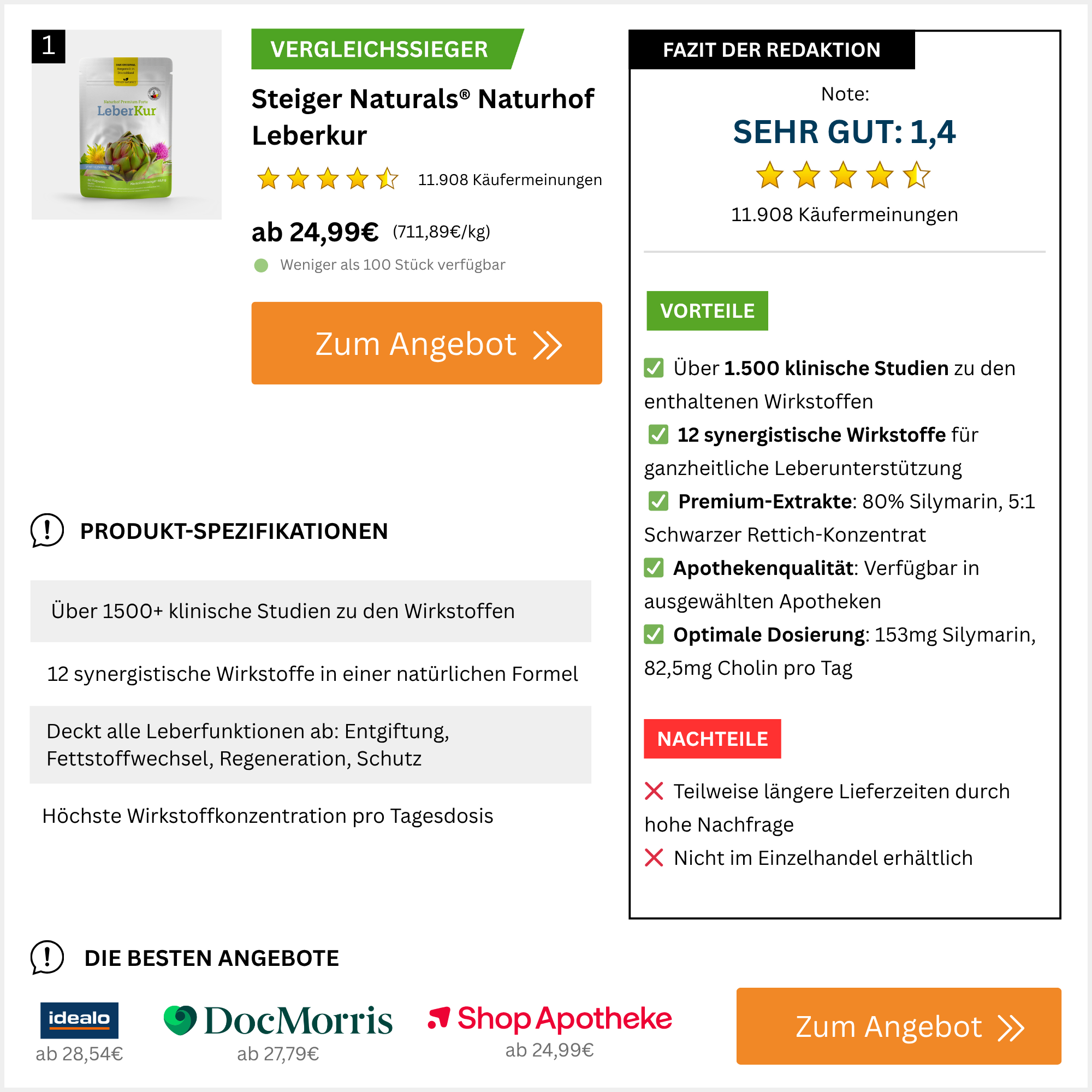 Unser Urteil: Die Naturhof Leberkur erfüllt als einziges Produkt alle fünf wissenschaftlichen Bewertungskriterien und rechtfertigt damit ihren Status als Premium-Lösung für hartnäckige Gewichtsprobleme.